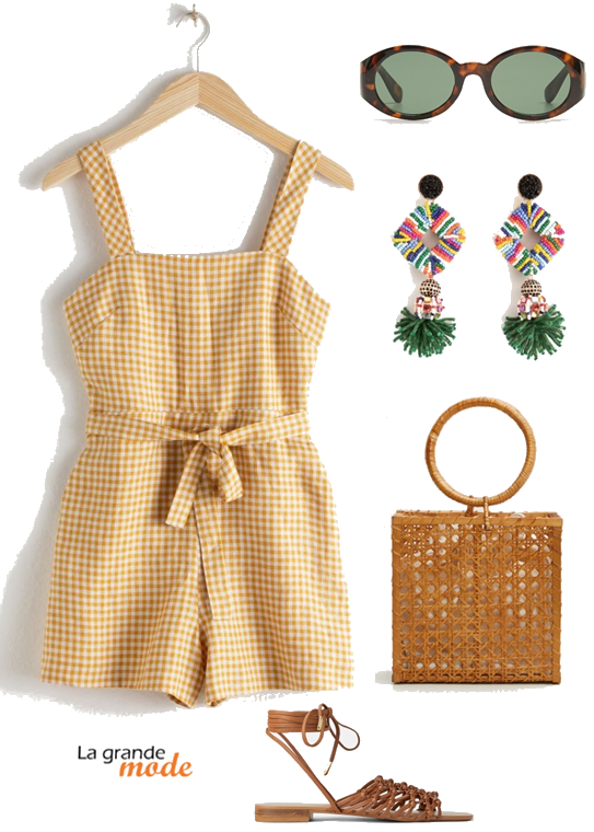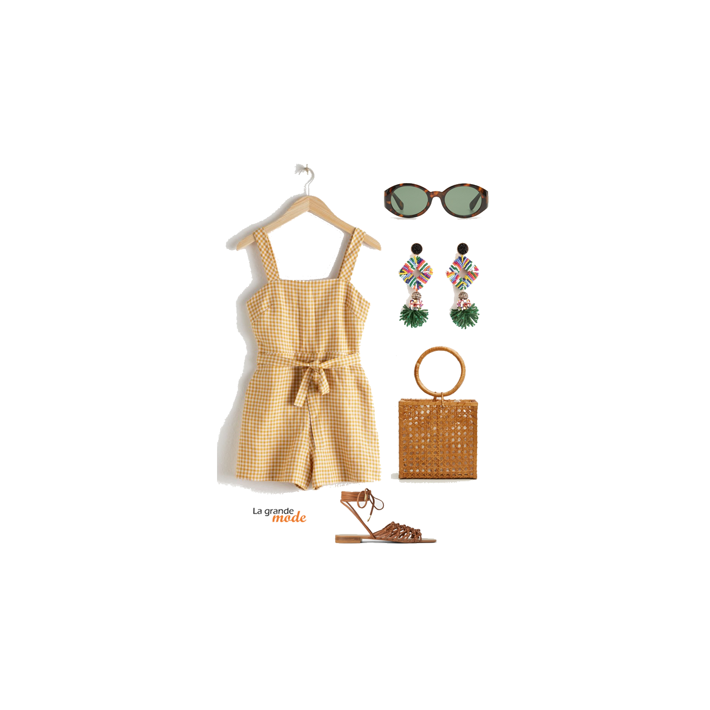 - Un combishort en vichy jaune et blanc. On aime son décolleté carré, son style baby doll et son tissu en lin mélangé aussi joli à regarder qu’agréable à porter.