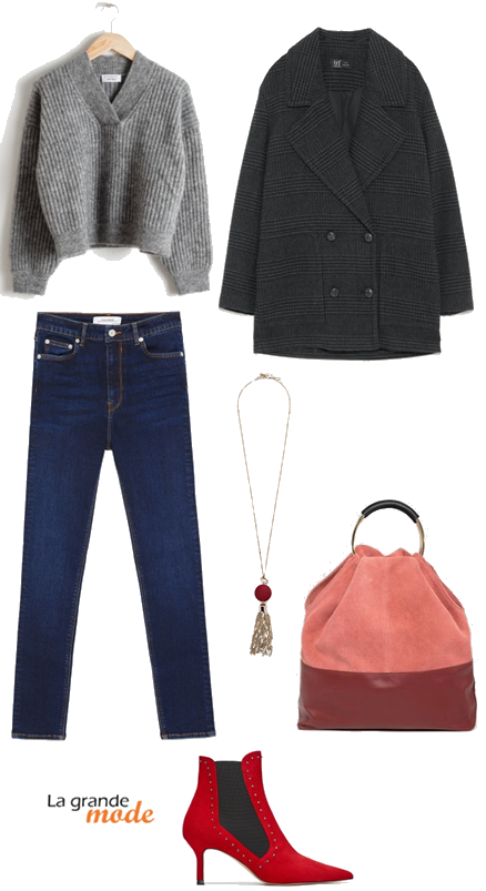 - Un manteau à carreaux gris. On aime sa coupe oversize et son boutonnage croisé qui lui donne un côté masculin très tendance.