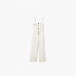 Rayures fines sur la combi, pois sur les escarpins à brides. Lin pour la combinaison, cuir pour le sac.