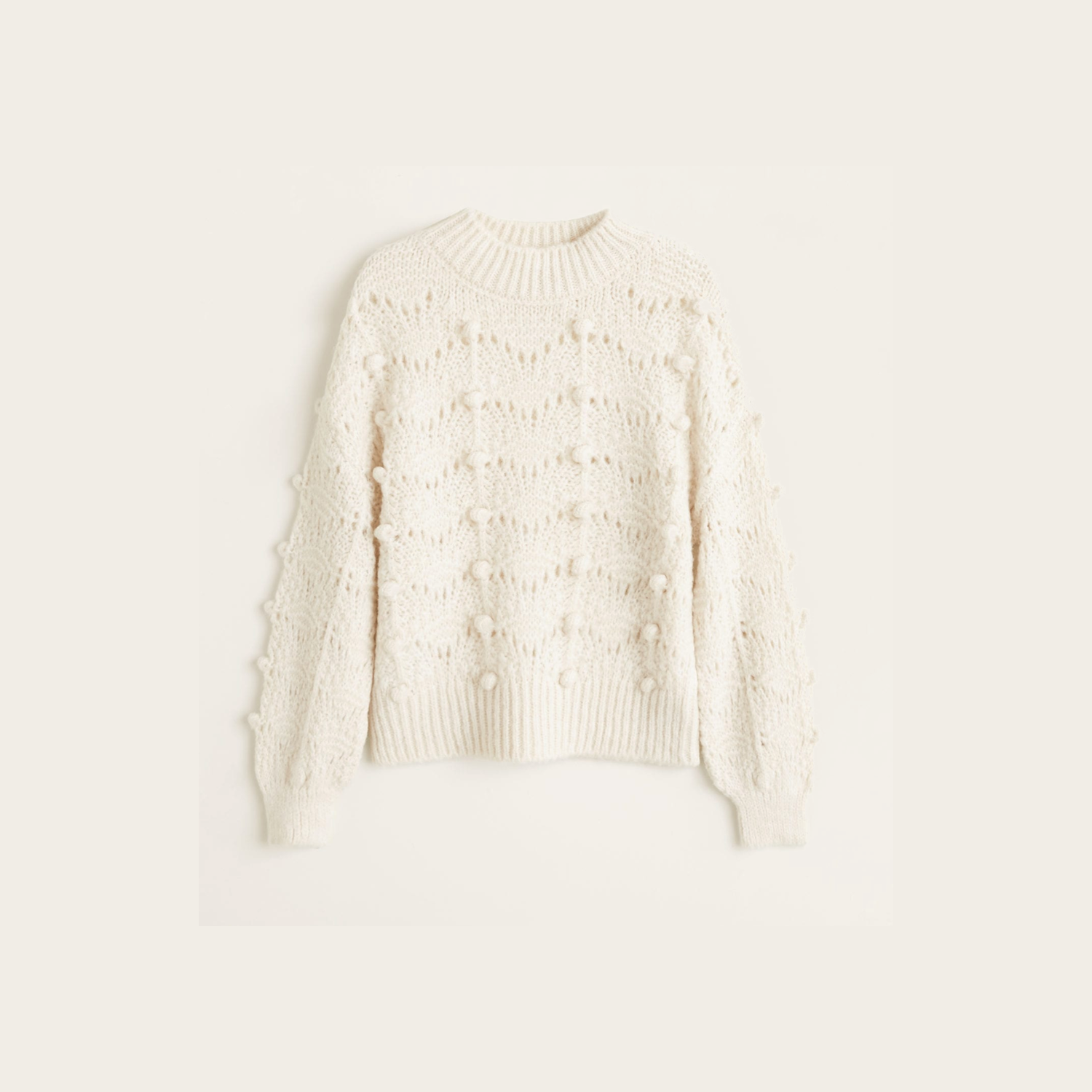 Une jolie maille ajourée, quelques pompons, un col tout rond….et nous ronronnons. Ce petit pull en maille Mango est l’archétype de la pièce mi-saison que l’on adore. Un écru lumineux qui donnera de l’éclat, notamment, aux plus brunettes d’entre nous. Une maille ajourée, pour nous faire patienter chaudement jusqu’à l’été. Des bords côtelés pour un aspect et un confort douillets.