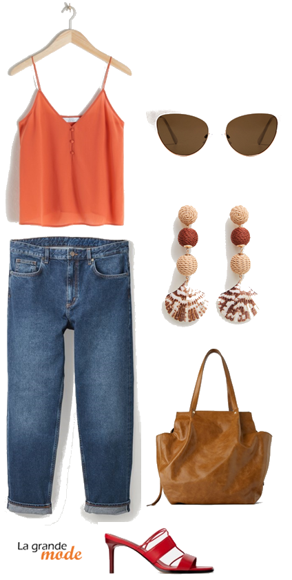 2. Un top style lingerie en soie. On choisit, volontairement, un top ultra-féminin, pour casser le côté androgyne et décontracté du jean boyfriend. Son orange pétillant apporte pêche et gaieté à la tenue.