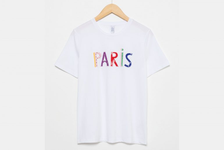 Focus, donc, sur ce t-shirt PARIS, simple et coloré mettant en vedette notre emblématique capitale (et tout ce qui va avec).