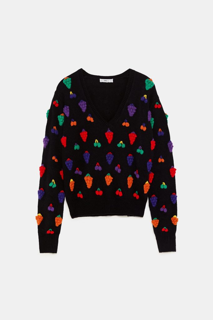 « Salade de fruits, jolie, jolie, jolie…. » Tu plais à La Grande Mode, assurément (#aaahh-Bourvil…)….Encore plus lorsque tu pares avec élégance et fantaisie un pull noir bien tristounet sans toi. On aime son col V qui dégage notre décolleté et apporte donc son lot de féminité. On craque, évidemment, pour ses broderies fruitées et colorées qui en font une pièce un rien effrontée. A s’offrir pour faire preuve de gaieté et d’originalité (un secret : il est soldé ;)).