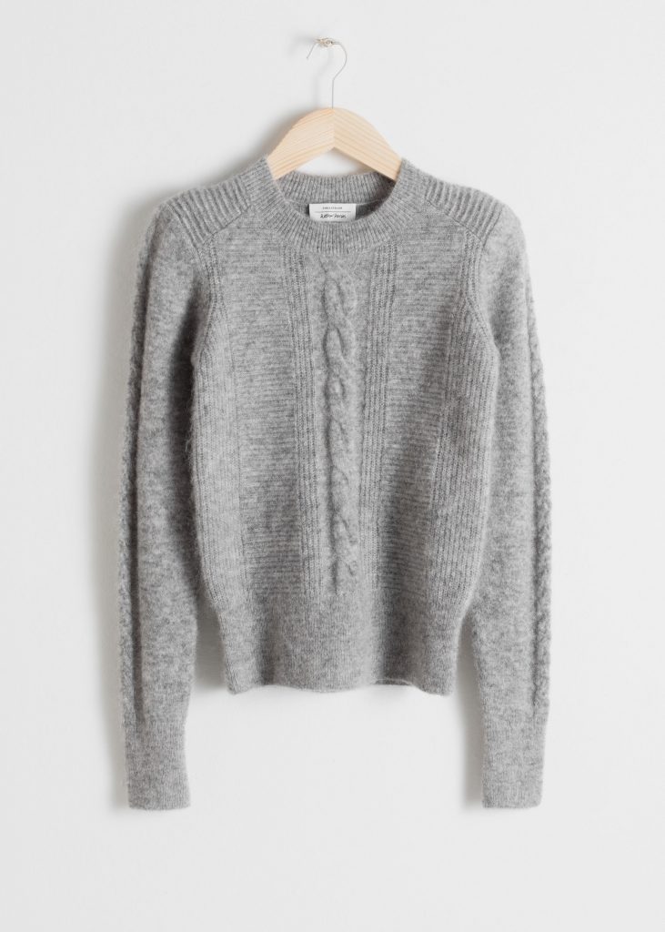 Simple. Basique (#big-up-Orelsan)….de quoi décrire parfaitement ce petit pull gris & Other Stories. On aime sa matière faite d’un mélange de mohair et de laine, son style tricoté légèrement vintage et ses torsades discrètes et élégantes. On le porte en mode casual avec un jean et des baskets ou en mode working girl avec une jupe tube en cuir, des escarpins et un manteau oversize. Une pièce non soldée, mais intemporelle.