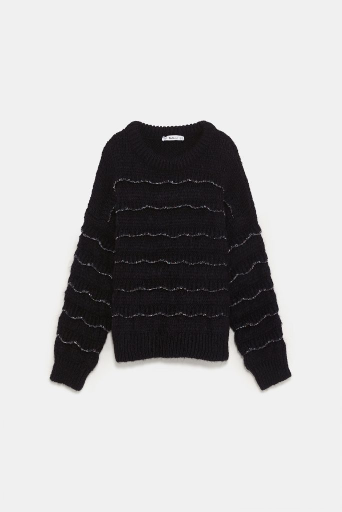 Ben oui, quoi ?!!…..Et puis, ne serait-ce que pour différencier nos pulls noirs dans nos dressings bien rangés (#emoticon-avec un-énorme-clin-d’oeil), il faut multiplier les modèles arborant THE détail différenciateur. Avec ce gros pull à volants et fils métallisés Zara, on tient une pièce rare, chic et ultra-tendance. Un réflexe, donc : shopper !