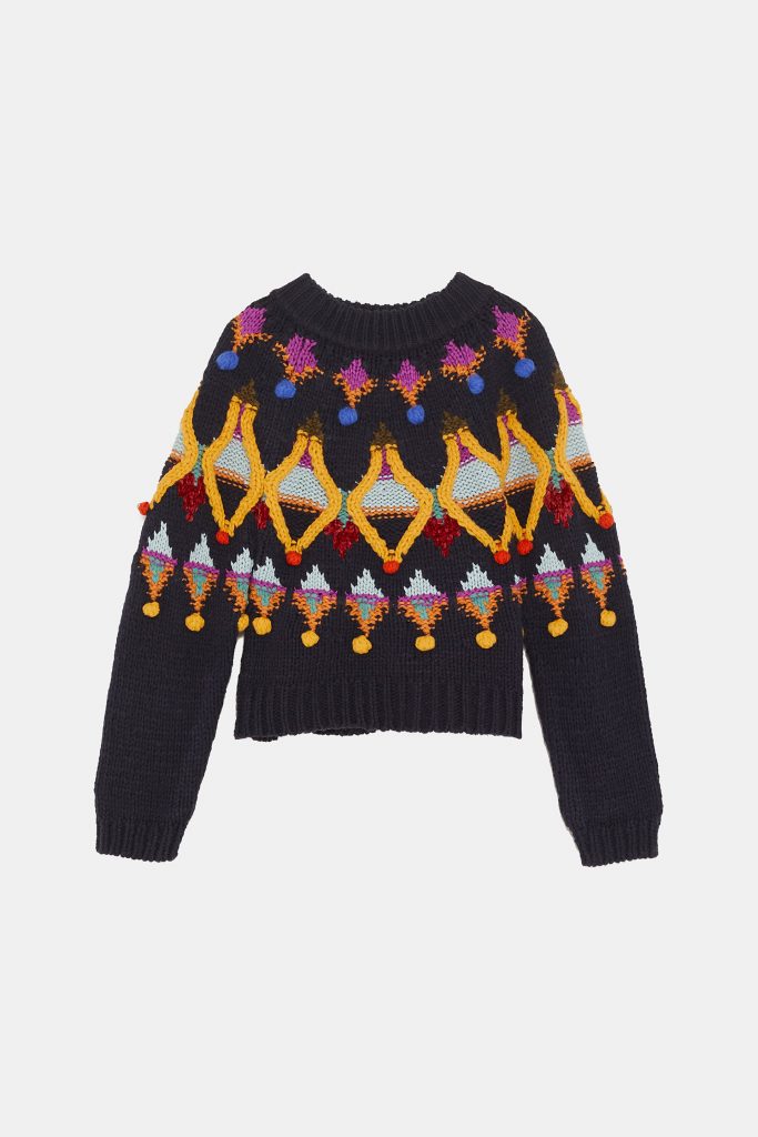 Un peu de couleur en plein hiver n’a jamais fait de mal à personne : implacable constat. Toutes broderies et tons colorés dehors, arborons donc ce petit pull en maille tout droit sortie des dernières nouveautés de chez Zara. On aime le mélange pompons-broderies, ses finitions côtelées qui accentuent son côté doudou et sa coupe courte, gage d’une grande féminité.